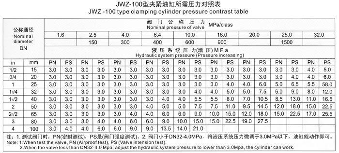 The test range of valve nominal diameter and nominal pressure for JWZ-100 model