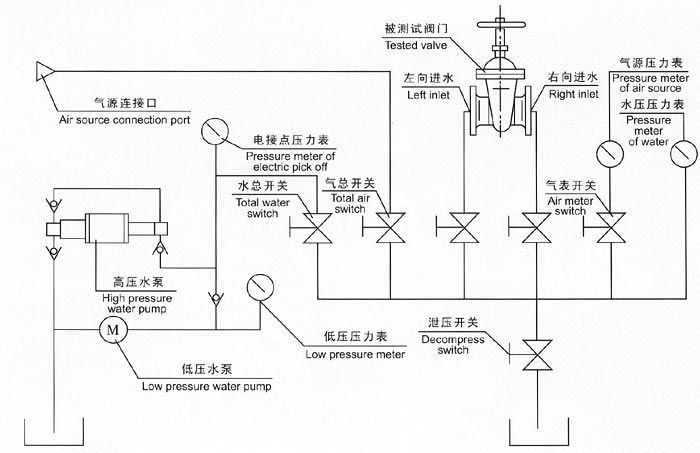 六、液壓供壓水泵開始工作前,先調節好電接點壓力表與被試驗閥門壓力相同,然后進行工作。