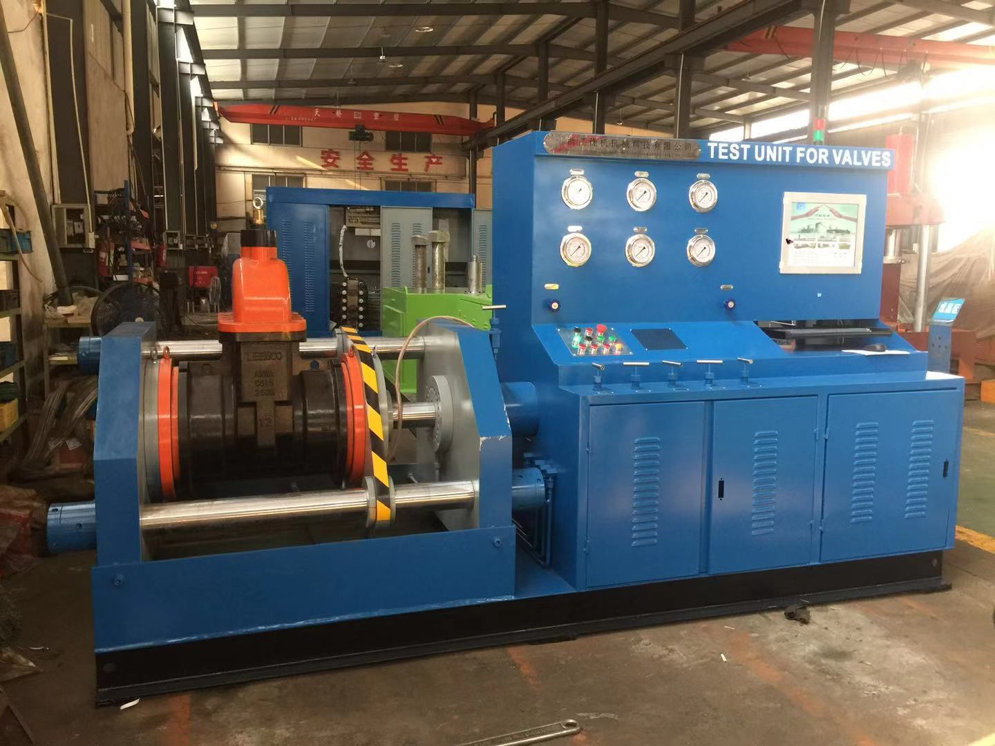 工作過程:根據閥門的公稱通徑和壓力調整油缸壓緊壓力——壓緊工件——打開低水泵快速注水——打開高壓水泵——保壓計時——卸壓、復位。